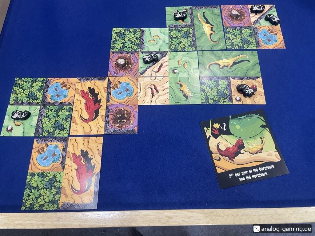 I found this game in the GeekPreview, too…and checked it out because it looked like an ideal candidate to play with kids: a card game with relatively simple rules…and dinosaurs!
